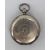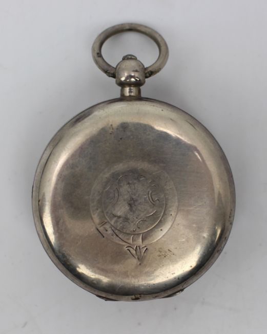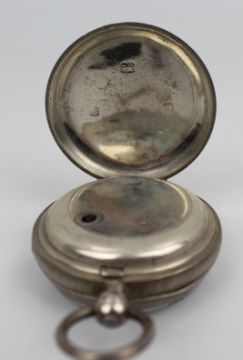 The silver case has a decorative engraving to the back and includes a hinged dust cover with keyhole access, indicating a key-wound movement.