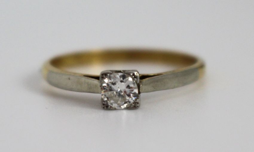 A classic vintage diamond solitaire ring, featuring an early brilliant cut diamond set within a white illusion square bezel.