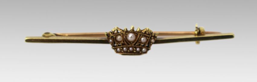 A simple bar brooch in yellow gold, set with a coronet motif decorated with seed pearls.