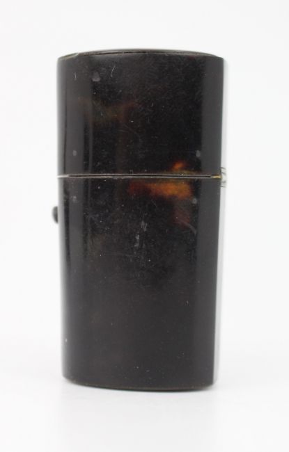 A good antique travelling inkwell of compact cylindrical form, the case veneered in a dark, richly figured material with subtle amber tones.