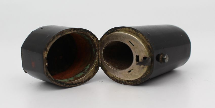 Opens via a side push-button to reveal a fitted brass interior, originally designed to hold a small ink reservoir (now absent).