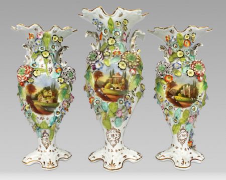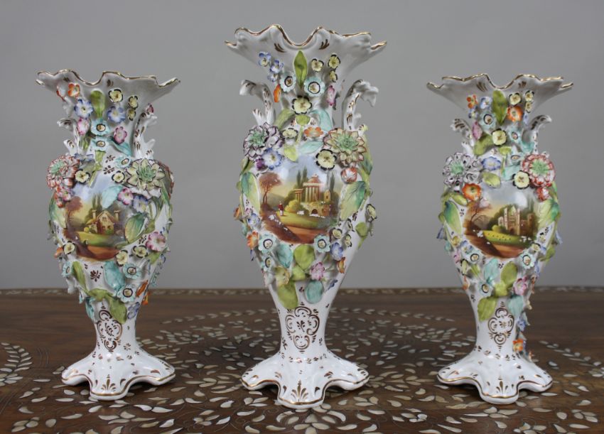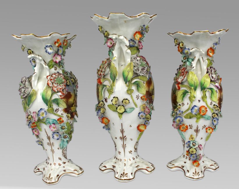 A decorative early-Victorian garniture of three English porcelain vases, unmarked and probably by Samuel Alcock & Co., c.1845–55.