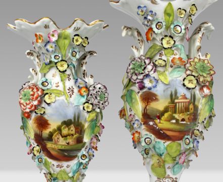The elaborate applied blossoms and leaves are in the Coalbrookdale (Coalport) flower-encrusted style.