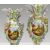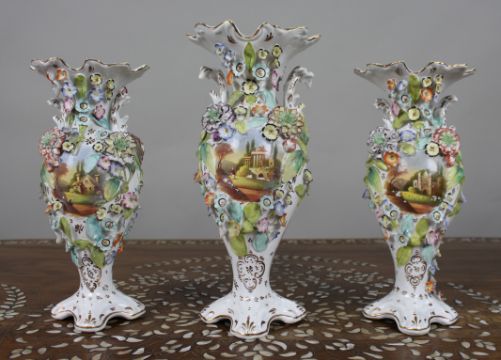 Each vase is richly encrusted with polychrome flowers and foliage, framing hand-painted rural and classical scenes: the centre with a temple landscape, flanked by cottages and Gothic ruins.