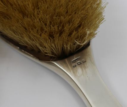Minor bristle thinning to one brush and a small loss to the silver rim of the mirror, as shown.