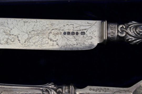 The knife and fork are of large proportions, finely engraved with vine and foliate decoration, and fitted with ornate cast handles featuring scrollwork and vacant cartouches.