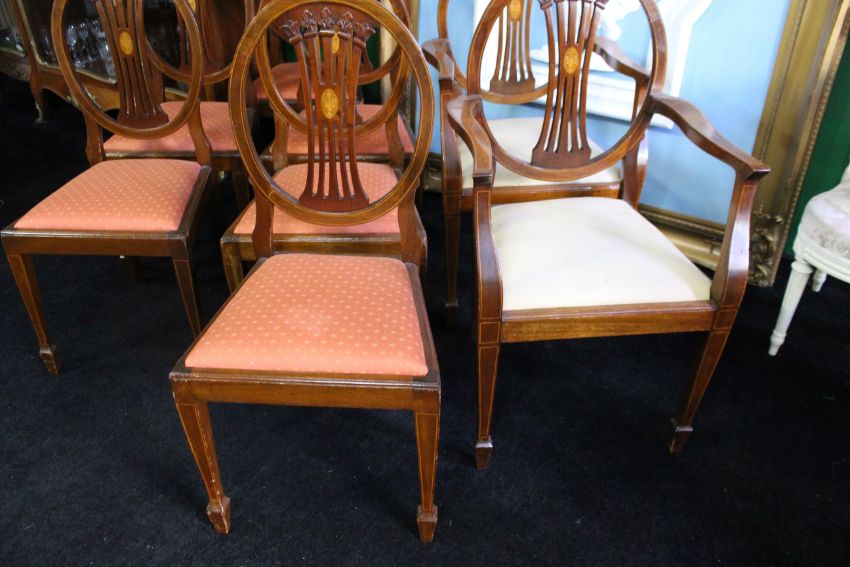 The chairs have well-figured mahogany frames with satinwood stringing and inlaid detail, featuring oval backs with fretted splats and a central inlaid motif.