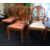 The seats are upholstered with drop-in pads: the two carvers in a neutral fabric, the six dining chairs in a patterned red upholstery.