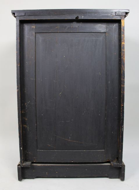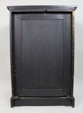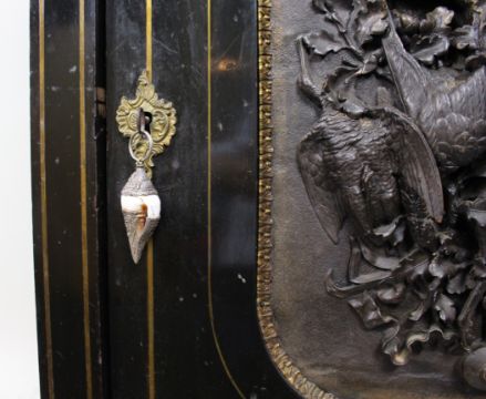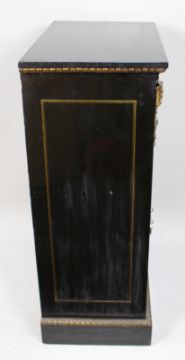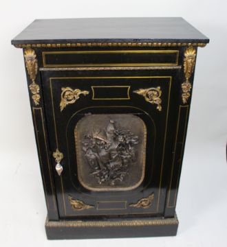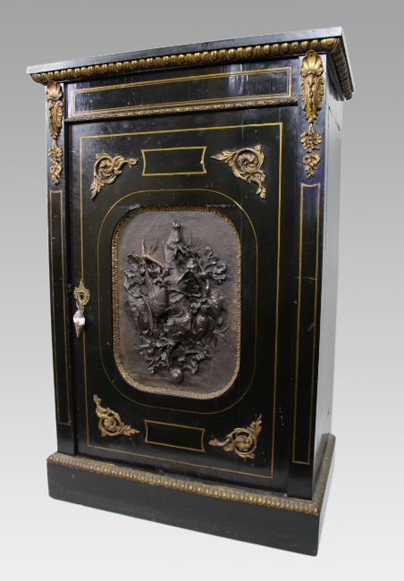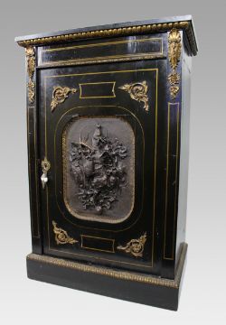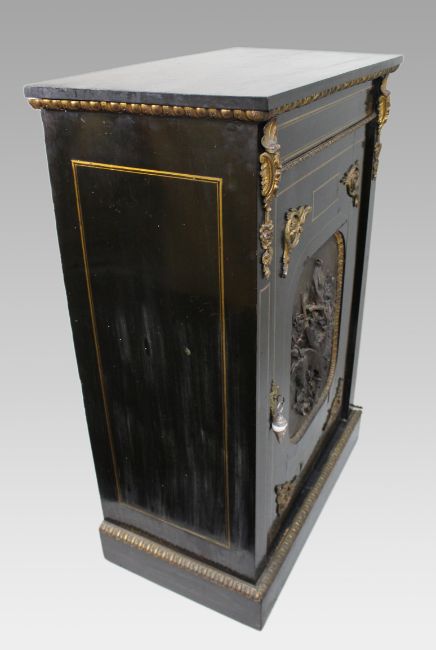 Ebonised wood throughout with brass stringing and gilt metal mounts, and a particularly attractive electrotyped panel depicting hanging game birds and foliage.