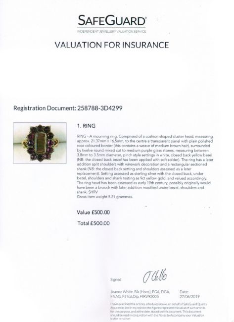 This Victorian mourning ring is centred with twelve purple glass (paste) stones, set in pinch-style settings.