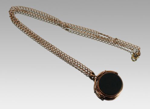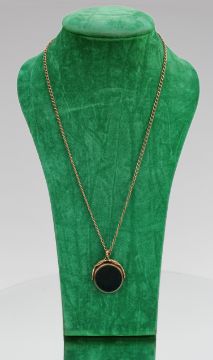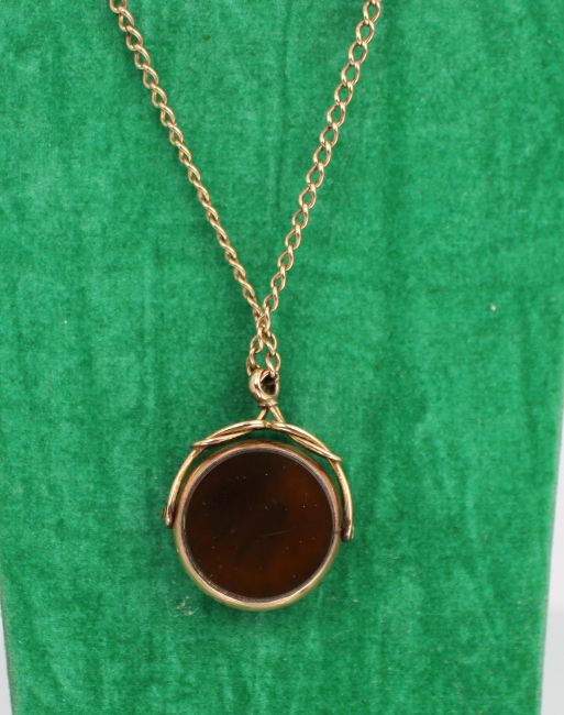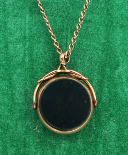 An attractive Edwardian swivel fob pendant necklace in solid 9ct rose gold, set with a rotating circular mount inset with bloodstone to one side and carnelian to the reverse.