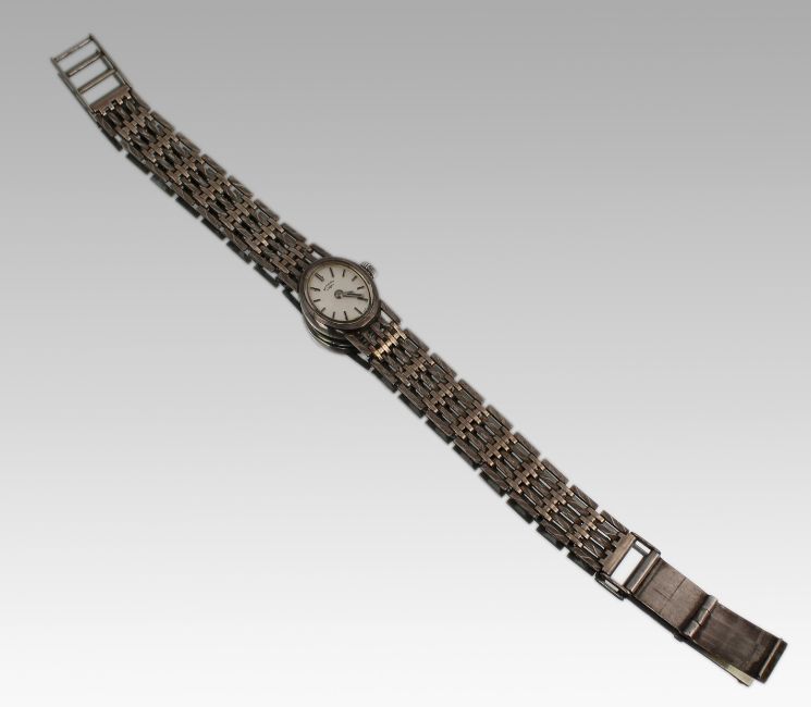 The case is attached to an articulated sterling silver bracelet of fine rectangular links, fully hallmarked to the clasp for London 1969, with maker’s mark JAM for J.A. Main Ltd.