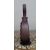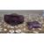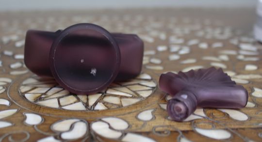 A decorative modern frosted glass scent bottle in a soft purple tone, of circular form with moulded radiating fan detail to one side.