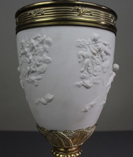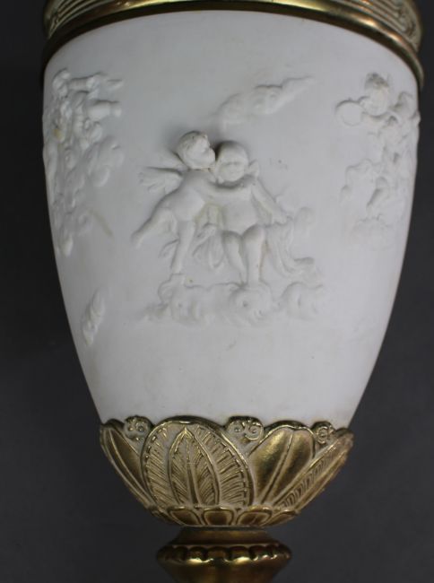 A late 19th-century Continental bisque porcelain candelabrum, the vase-form body moulded in relief with cherubs amidst clouds, mounted with gilt brass (ormolu) fittings and raised on a stepped square base.