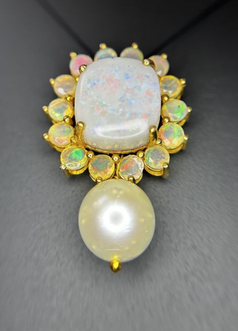 Title: Beautiful 24.50ct Natural Australian Opal and Southsea Pearl Pendant & 18k Gold