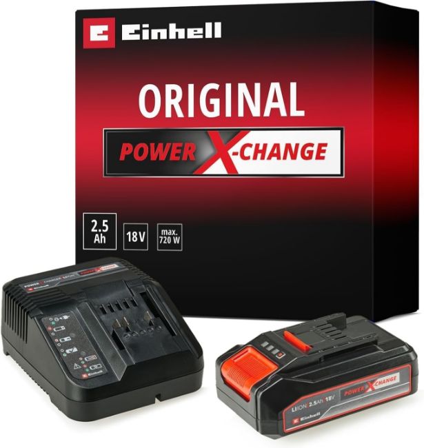 The Einhell 18V 2.5Ah PXC Starter Kit with an 18V 2.5 Ah Power X-Change rechargeable battery and fast charger is a member of the multifunctional and completely interchangeable Power X-Change rechargeable battery system from Einhell