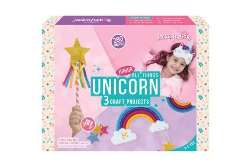 This unicorn craft kit includes 3 craft projects - Make a pretty looking unicorn mask with a shiny glitter horn, make a magical wand, and make a colourful glittery rainbow nameboard !!